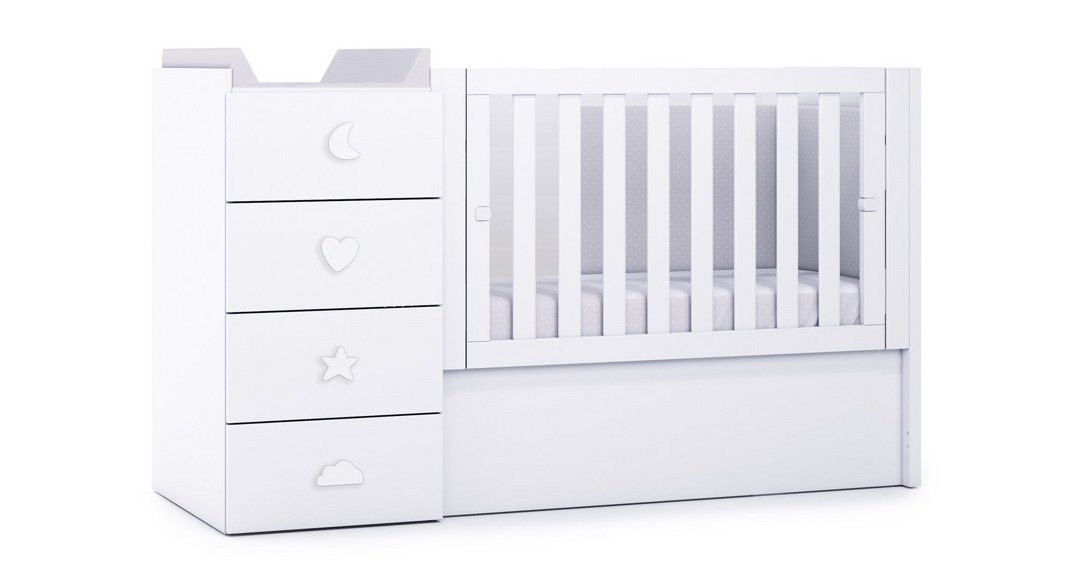 La cuna convertible JUST BUBBLE de 60x120cm en blanco mate, tiene el tamaño perfecto para espacios infantiles reducidos. Se convierte en cama junior de 90x200cm con cómoda infantil de 4 cajones y escritorio infantil. Puedes añadir un cajón inferior opcional para aprovechar al máximo todo el espacio. Descubre cada uno de sus detalles y colores.