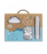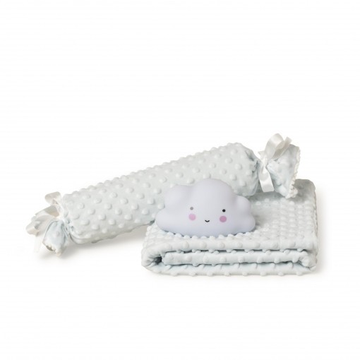Precioso set formado por una manta con relieve de burbujas, un cojín caramelo antivuelco y y lamparita acompañamiento con forma de nube, un detalle perfecto para regalar a un bebé. Acabado aterciopelado.Composición: 100% poliéster.Medidas lámpara: 15.5 x 9.2 x 8.3 cm.Medidas manta: 80 x 110 cmPilas: 3 x LR44/AGI3
