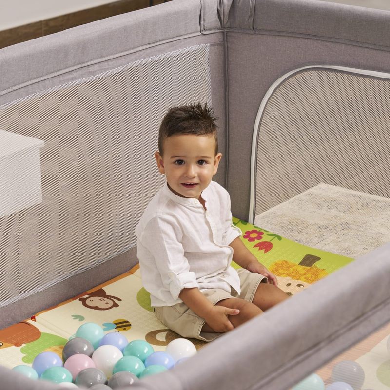 Con nuestro parque de juegos para bebé crearás un espacio de juego seguro y estimulante para jugar y explorar. Tendrás la tranquilidad de que tu pequeño se divierte con total seguridad mientras desarrolla sus habilidades motoras y sensoriales. Además, puedes complementarlo con una alfombra de juegos para mayor confort y protección.
