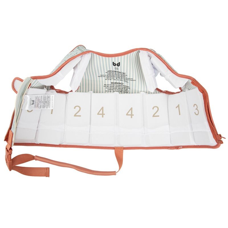 En su interior, este chaleco flotador tiene ocho compartimientos, cada uno de ellos con tres piezas que proporcionan la flotabilidad adecuada a tu bebé y que puedes ir quitando en función de que nuestro bebé vaya mejorando su capacidad de flotación, poco a poco, sin darse cuenta y sin ayuda.