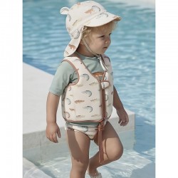 Su diseño envolvente garantiza una protección completa, mientras que el tejido transpirable y de secado rápido permite que tu bebé se mantenga fresco y cómodo en todo momento. Además, su cierre ajustable con cordón proporciona un ajuste seguro para que no se mueva mientras juega.